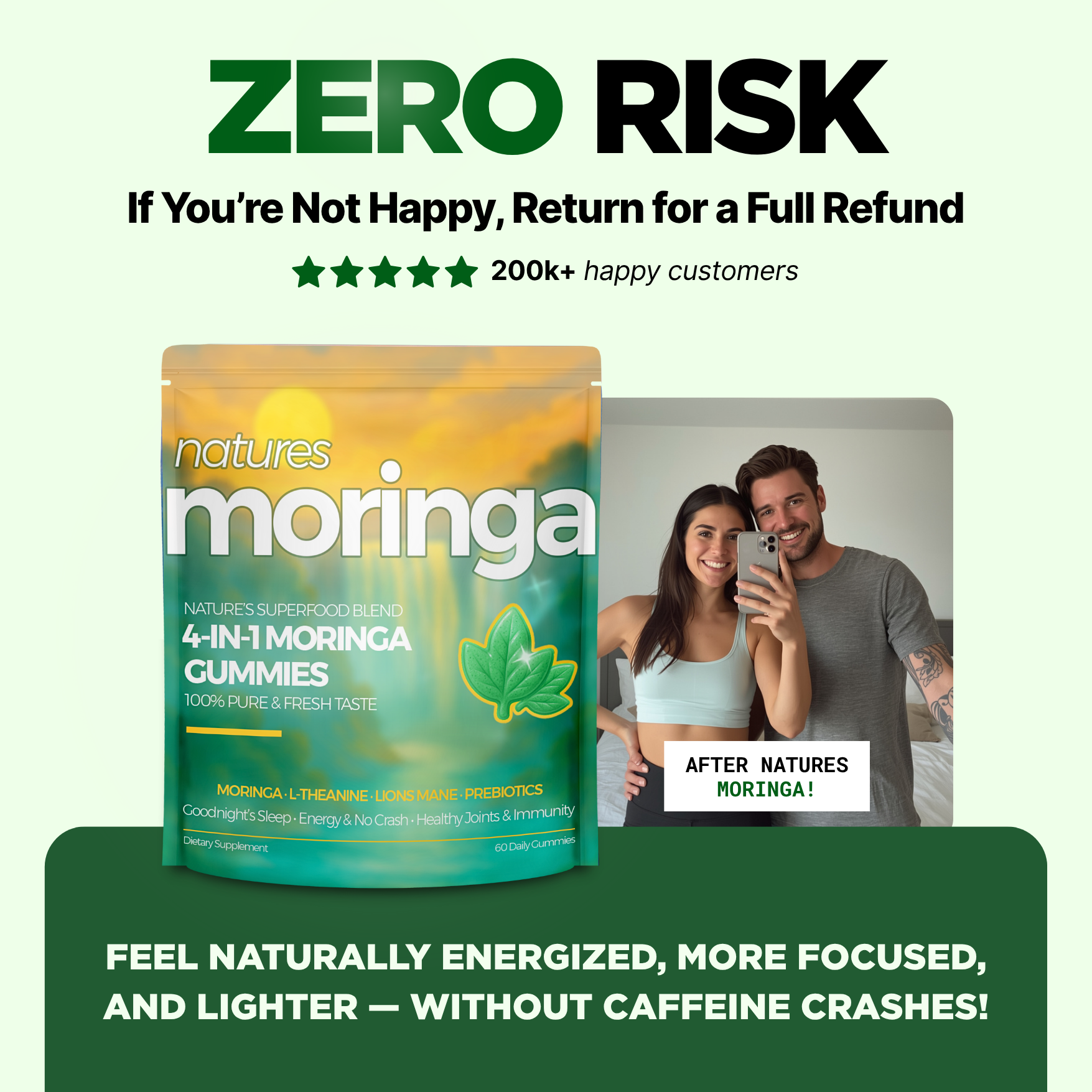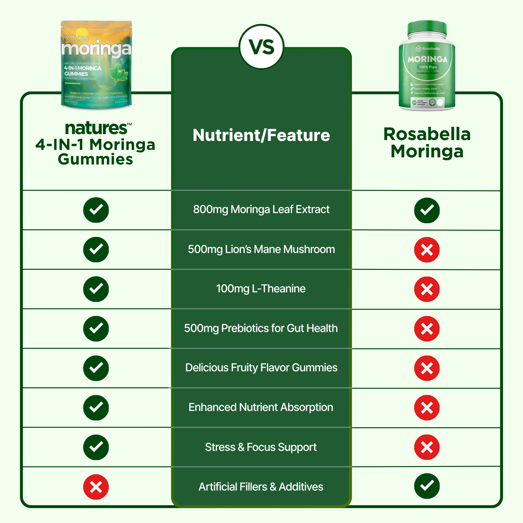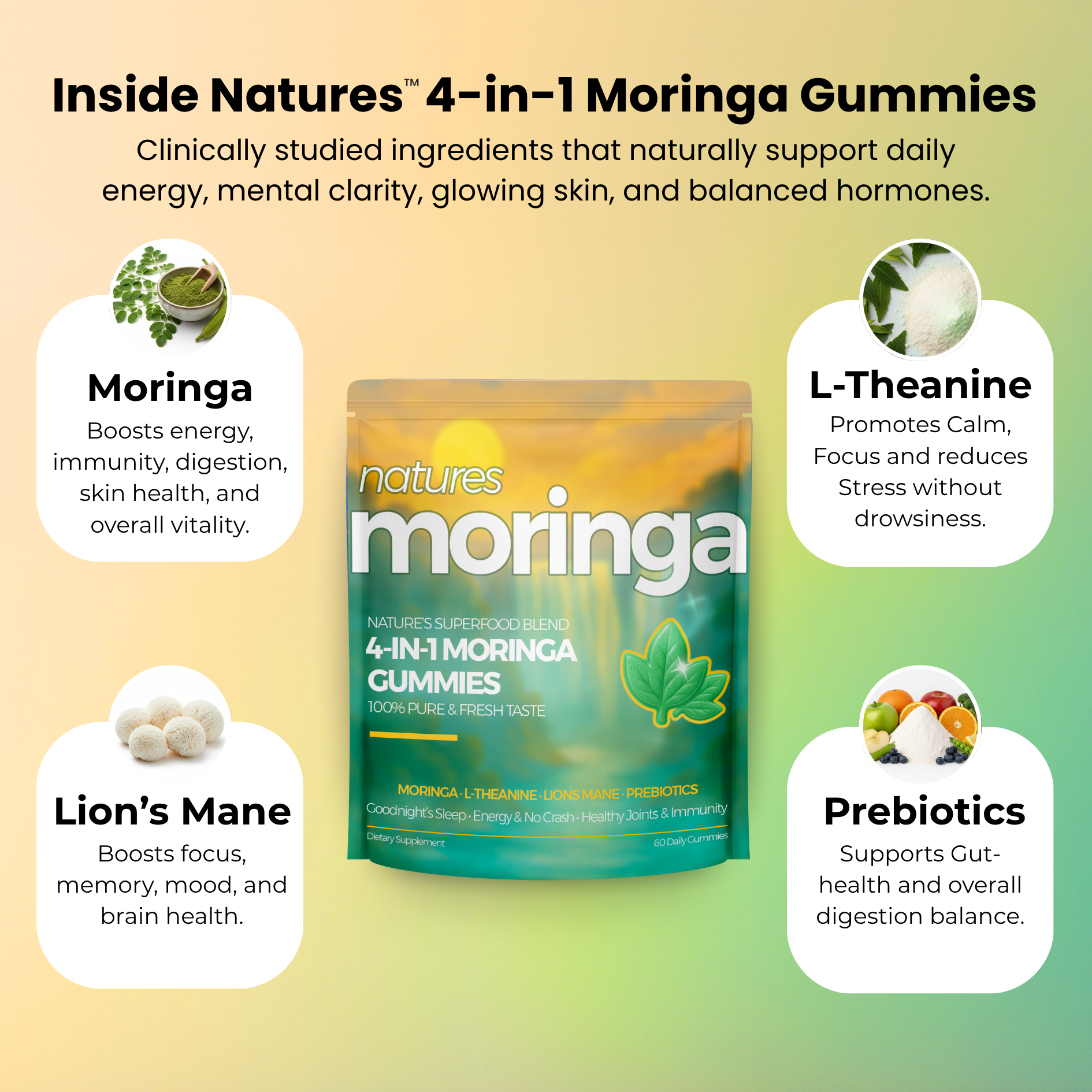 Natures® 4-in-1 Moringa Gummies combine powerful ingredients designed to support your overall well-being. Moringa delivers essential nutrients while promoting restful sleep. L-Theanine aids in fostering calm focus to enhance mental clarity. Lion’s Mane supports brain health and cognitive function, helping you stay sharp. Prebiotics improve gut health and digestion, contributing to a balanced microbiome. Together, these gummies provide a convenient, expert-formulated way to nourish body and mind daily.